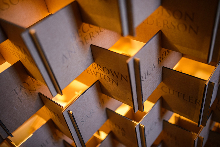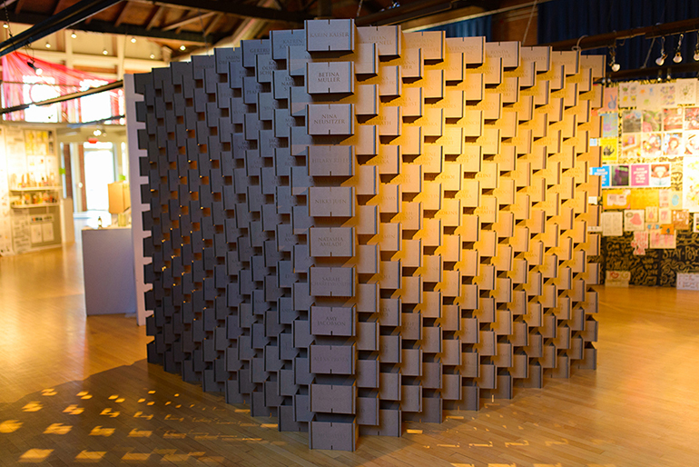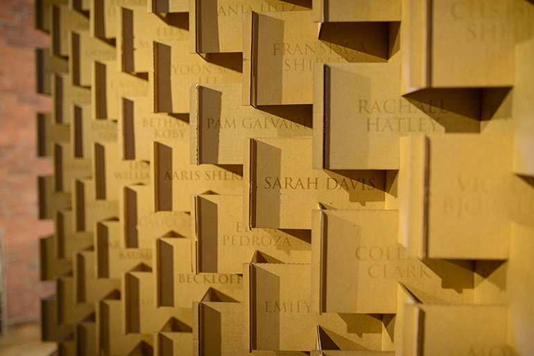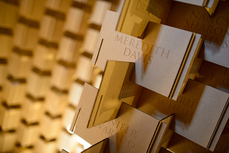 After spending several semesters researching women in design history, I wanted to create a meaningful representation of women in design because we take up so little space in history books despite often playing at least a strong supporting role if not a more significant role in design history. Women are minimized in so many ways culturally as well as within art and design so I wanted something that would do the opposite. I built basically a monument to women in design focusing on equal billing not matter whether you were famous or not. The build is modular so it can be assembled in any way I might want. I started with a room but have plans for other interpretations. The rooms was 8’x8’x7’. It features almost 1,500 names of women in design both famous and potentially unknown side by side.