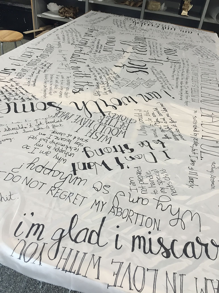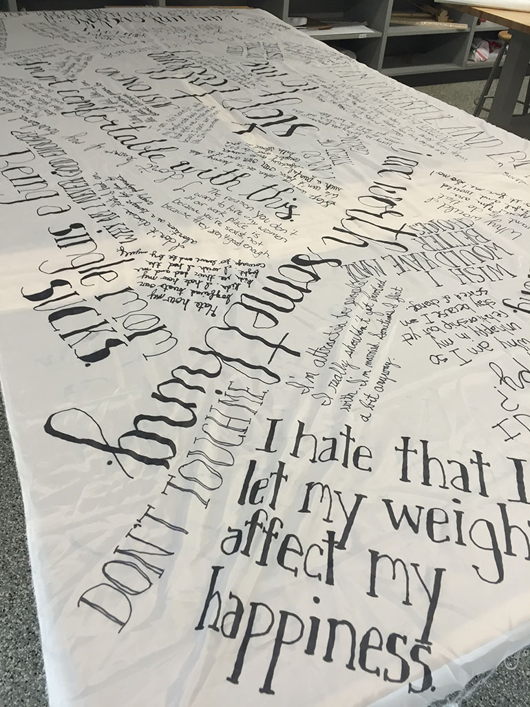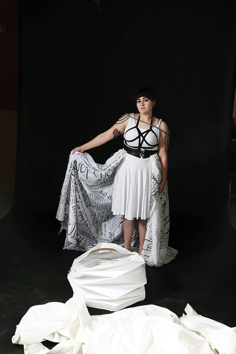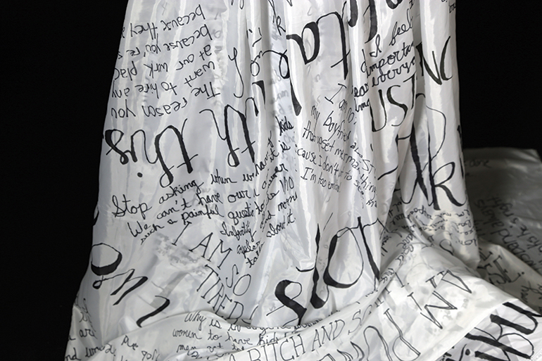 The final stage involved moving to a place of empowerment and a thought on a new direction. I struggled with this phase the most because I have no good answer on what the new reality might be. I am still trying to figure it out for myself. However, life intervened and I kept thinking about how our secrets and the things we are taught are not okay to even think as women often define us and control our existence. It became clear that this new stage needed to speak to breaking that pattern. During my marriage, I held so many things inside me because I felt that I couldn’t talk about them. It wasn’t okay to say them. However, I felt power, relief, and acceptance once I started to actually say them. Moreover, I was struck by how many women shared the same thoughts. It occurred to me that all women probably had things they couldn’t say for so many reasons. I created a basic submission form and posted the link on Facebook inviting the women in my life to both respond and share with other women. I was floored by the responses I got. So many felt like I could have written them. All the pain, shame, and self-hate came out in the words. Surprisingly, I found this empowering. Perhaps if we start to have the courage to say these things, we can change the reality for women. My plan originally was to screen print the words on fabric but again time and resources intervened so I wrote the words on two large pieces of fabric. From there, I needed to decide the final form this would take. I liked the idea of armor as a reference both to female empowerment as well as protection. The words could protect the woman in battle. The final form was dress made from the fabric and formed to reference armor.