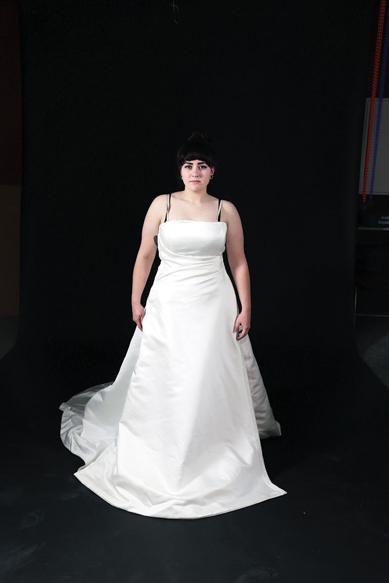 After arguing back and forth my the course instructor and researching wedding dress lore, feminist artists, and even biology, I came upon a clear direction for the project in the idea of metamorphosis—the change from one thing into something completely different. The transformation from a caterpillar to a butterfly takes place in three distinct stages. The caterpillar is the first stage. It then goes into the chrysalis stage where it is encased in a cocoon. During this stage, the caterpillar is basically destroyed in order to become a butterfly. The final stage is the butterfly. The new butterfly does retain some awareness of it’s life as a caterpillar. While I did not want a literal reference to this process, the idea of three stages and destroying oneself to be reborn better stuck with me. I also thought about the idea that all our cells are completely new after seven years. That means that I was biologically a completely different person from the start of my relationship than when my marriage ended. It also meant that I am close to having no part of my physical form having ever had any contact with my ex husband. All of these ideas lead me towards a three stage performance starting with my wedding dress and ending in a new forth that embodied growth and empowerment.