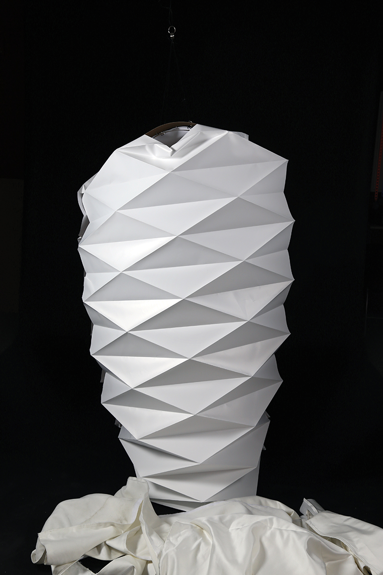 The next stage involves constructing a “cocoon” that’s part are stored or hidden inside the bottom of the dress. I use the word cocoon loosely. I like that this stage performs the same function but want to distance myself from a literal representation. This stage also proved the most problematic because of construction issues. With more time and money, perhaps I could have come up with a solution that could be activated with little effort from the woman. I found a template for a paper lampshade and worked out the construction to make the template useable for a life-size version. The woman is able to lift the cocoon up and hook it into place. It covers her as she makes the transition into the third stage. I considered the idea of somehow incorporating the dress into this part as part of the destruction of the old to make the new, but time and resources determined this would not be feasible. I find the simplicity of the result beautiful and appropriate as all the societal shoulds have been stripped away allowing for a new form to take shape.
