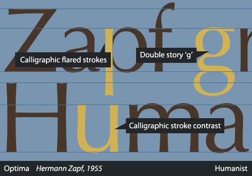 Another interesting characteristic of Humanist sans serifs is that their proportions often derive largely from Roman inscriptions and early serif typefaces, rather than 19th-century sans serifs as the Neo-Grotesques did. Because of this design process involving older letterforms, the lowercase “a” and “g” are most often two-story in Humanist sans serifs. All of these characteristics combine to make most Humanists a more legible choice than other types of sans faces.
