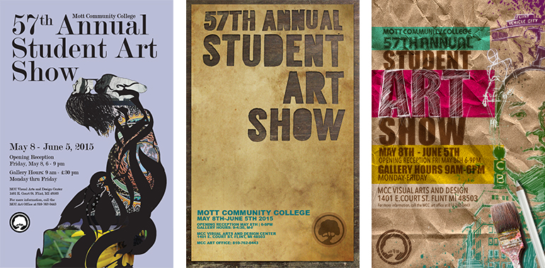 Every year, Mott Community College hosts an art show with selected student work. The students in the class have the opportunity to design the poster for the annual student show held in May. The purpose of this project is to: promote the student show, to provide information about the show, to inspire viewer’s to attend the opening of the show, and to promote the art program at Mott Community College.