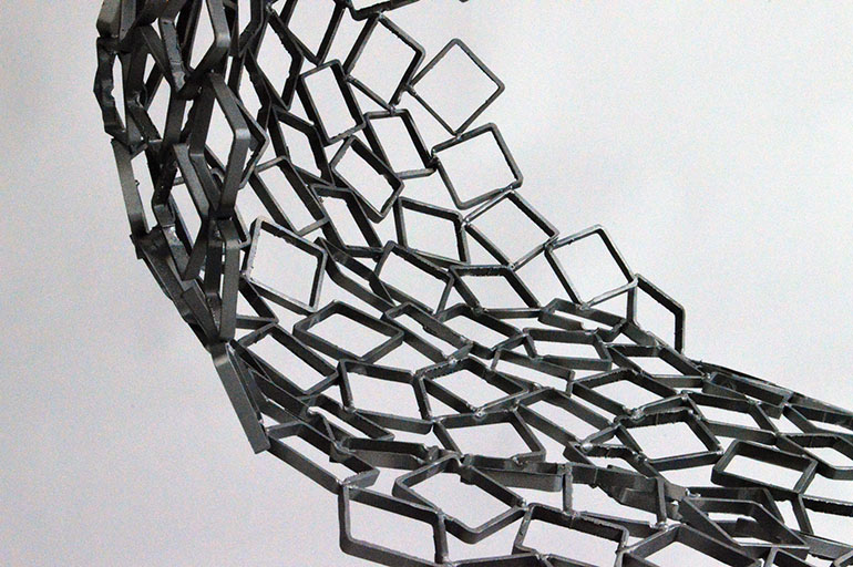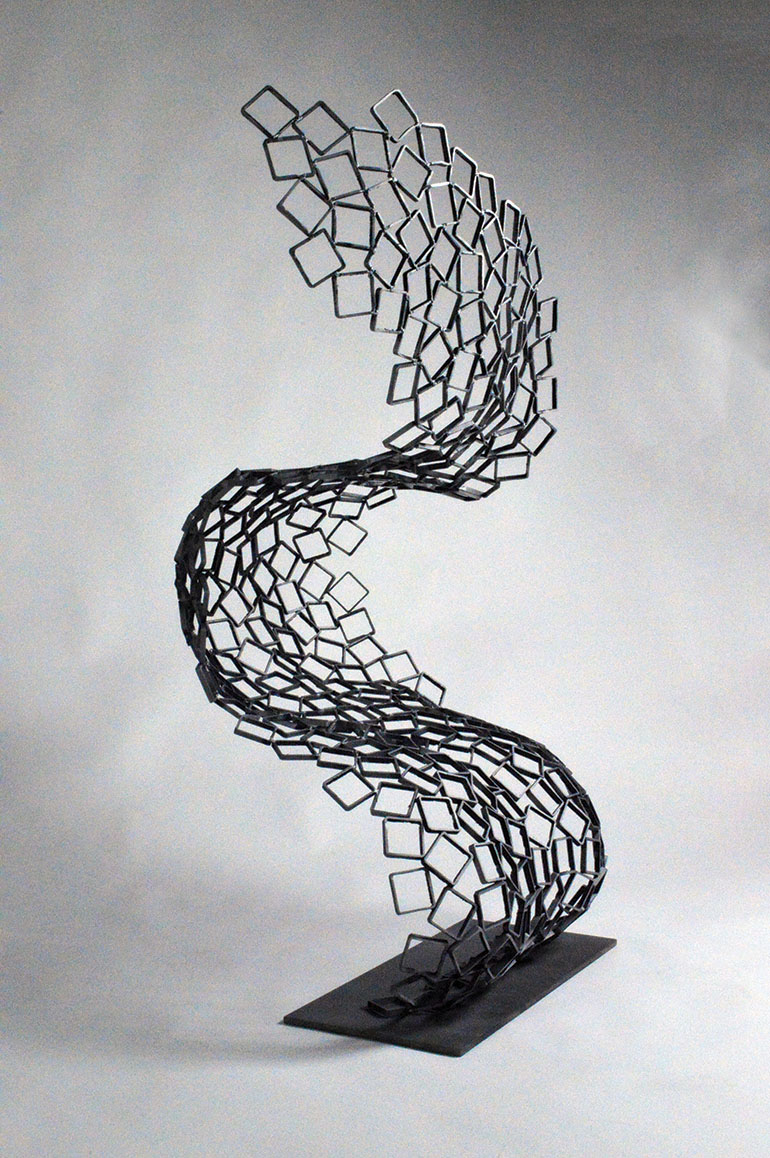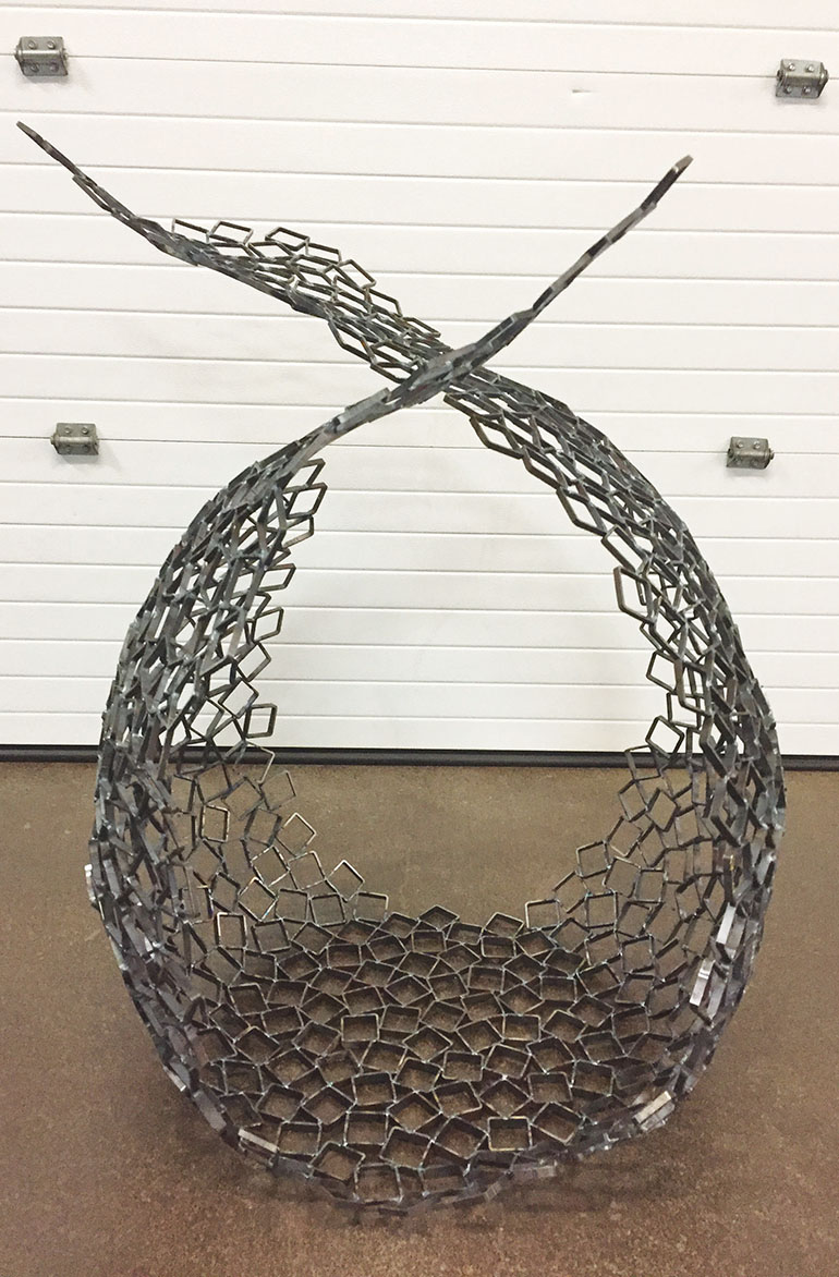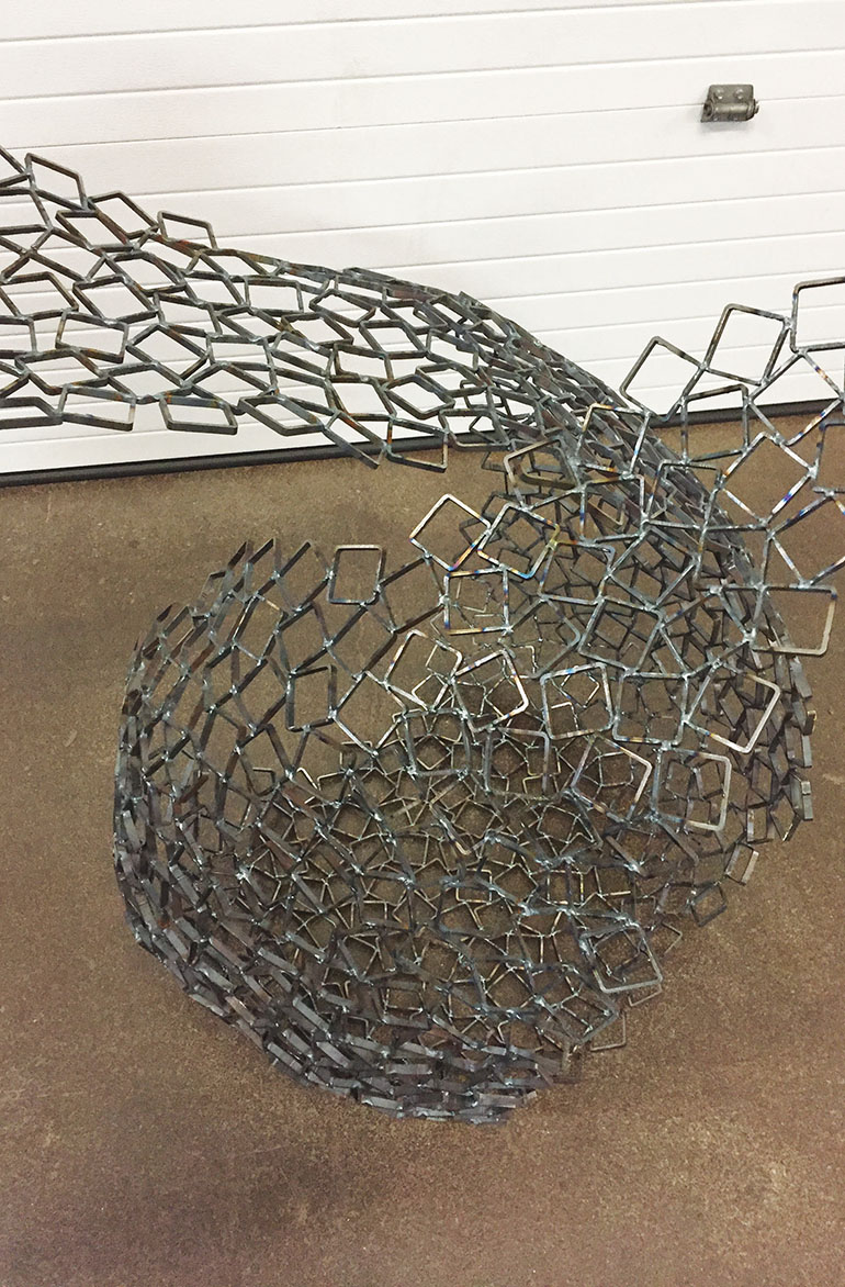 TIG welding proved to be the best methodology for me creating the forms I wanted to explore. I saw an image of a sculpture made to squares that inspired my thinking about metal sculpture. My metal sculptures involved cutting square metal tubes into pieces and then welding them into forms that play off a lightness as well as often test gravity. The forms have an organic feel while using a non organic material. Metal typically feels solid so my effort to produce a light form contradicts it's typical representation. These sculptures also helped me identify my need to create heavily process driven work. The process of cutting and welding the metal serves as a meditative process for me.