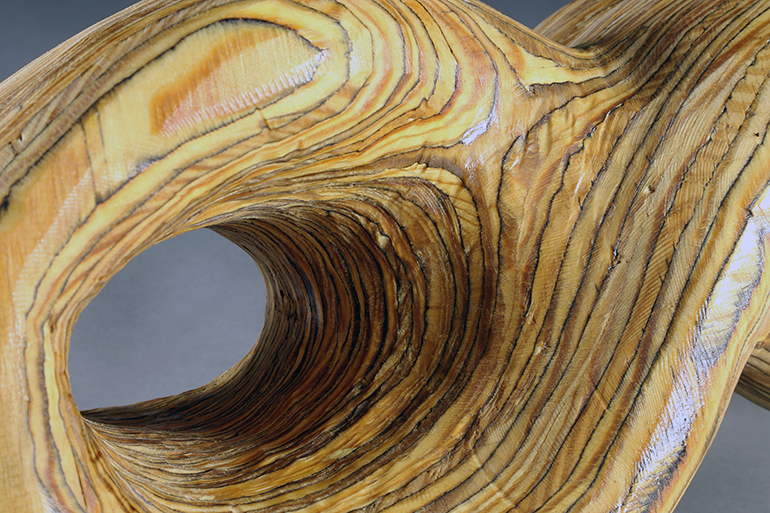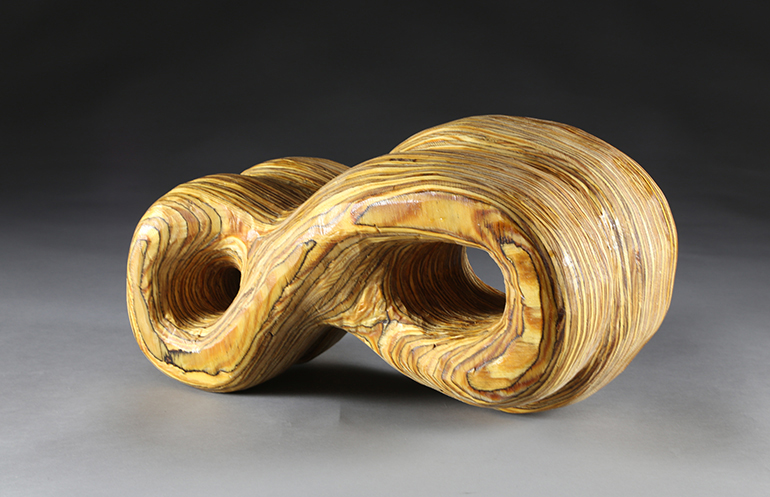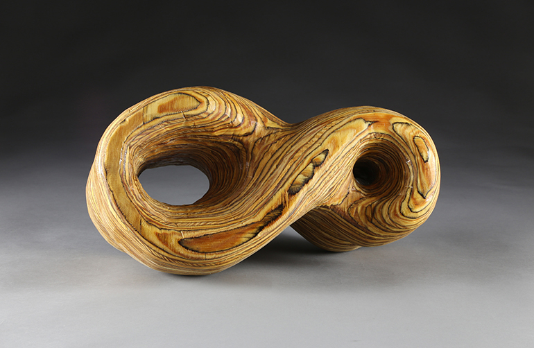 I saw plywood sculptures and became fascinated with how such a throw away material could be so beautiful. Plywood is viewed as a material to be hidden not used to construct a beautiful form. This form did not originally start with the goal of looking so much like an infinity symbol. My goal was to explore a dynamic, organic form. I believe it accomplished this even though the form is a bit cliche.