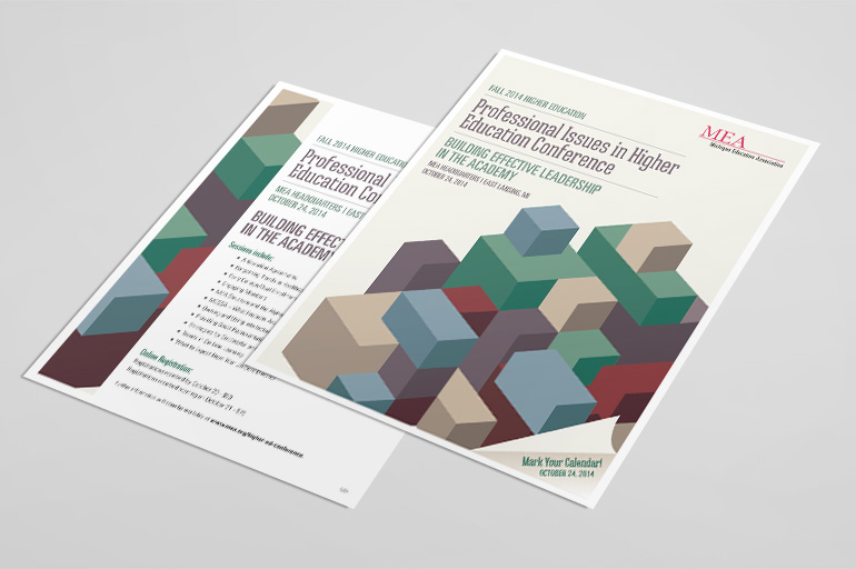 The Michigan Education Association’s Higher Education Conference focuses on issues in higher education. The 2014 conference focused on building leadership. The image I created for the cover of the program and the flyer focused on the idea of building in a more abstract manner. The goal was to show the sometimes complex relationship in accomplishing the goal of building leadership in the higher education environment.