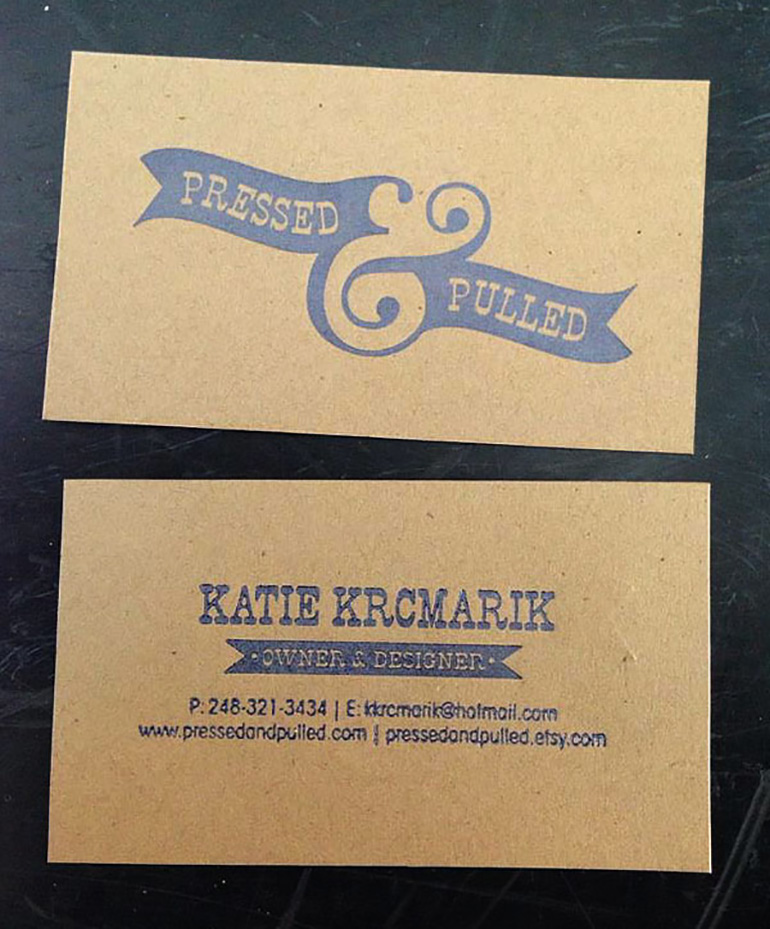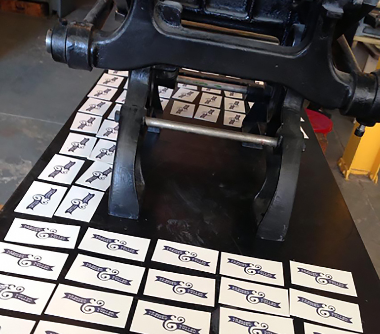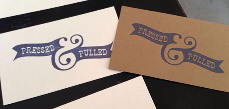 I developed this logo for that business interest. I designed with a sense of whimsy as well as a nod to the past. I also took into consideration any challenges that may occur with using it through letterpress printing or screen printing. I then took the files and had letterpress blocks made of the logo and business card back. I used a platen press to print the business cards.