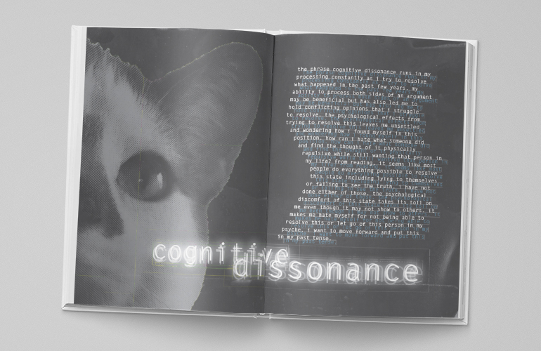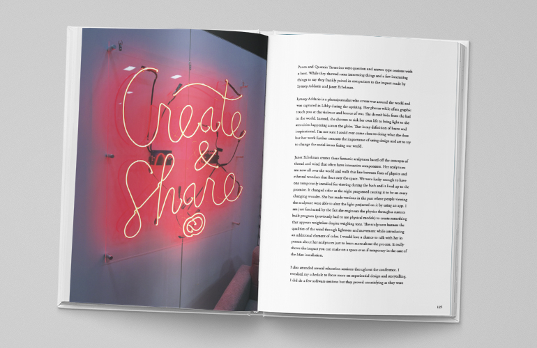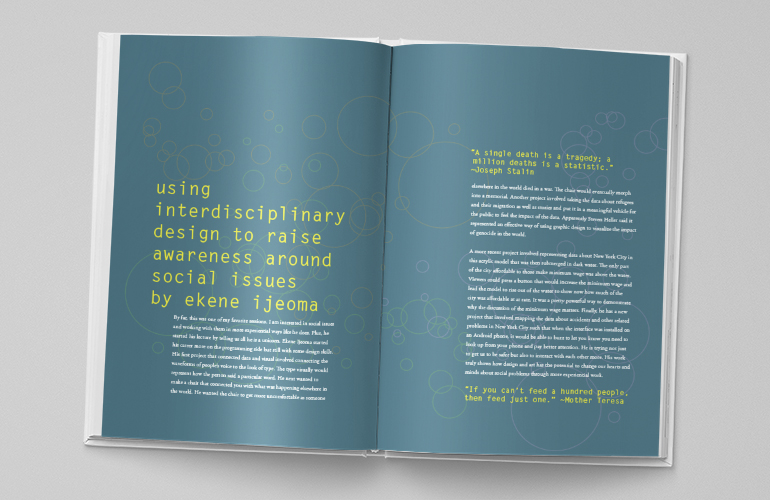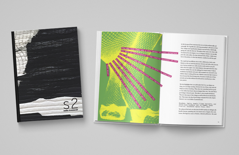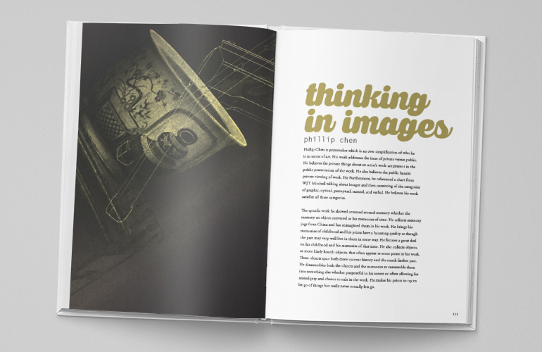As part of my graduate school requirements, I had to submit a monthly packet accounting for all my work during the month. I decided to combine all of the packets from my second semester into one book. As a professor, it's beneficial to have a book I can show students of all my process work when talking about process. It was also beneficial to me to see all my work in one location to reflect on how much I actually accomplished during the semester. My goal with the design was to unify all the separate packets as well as organize the semester's work by type into one final presentation.