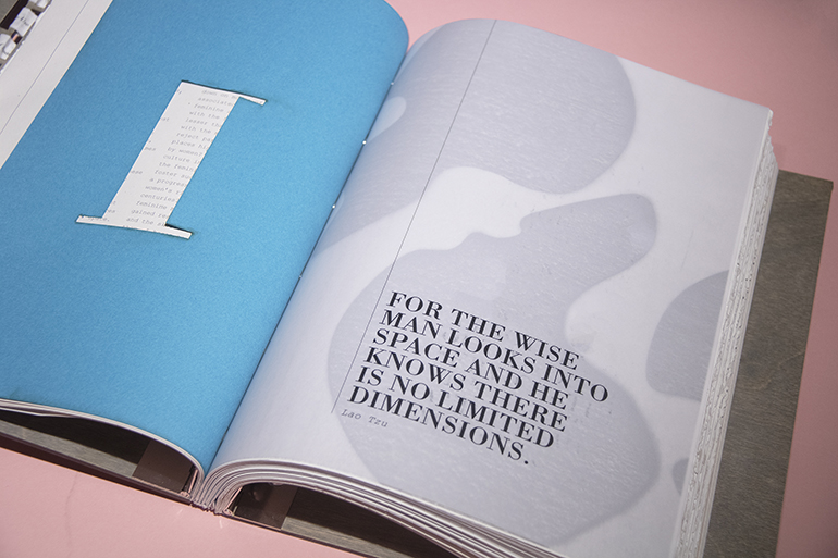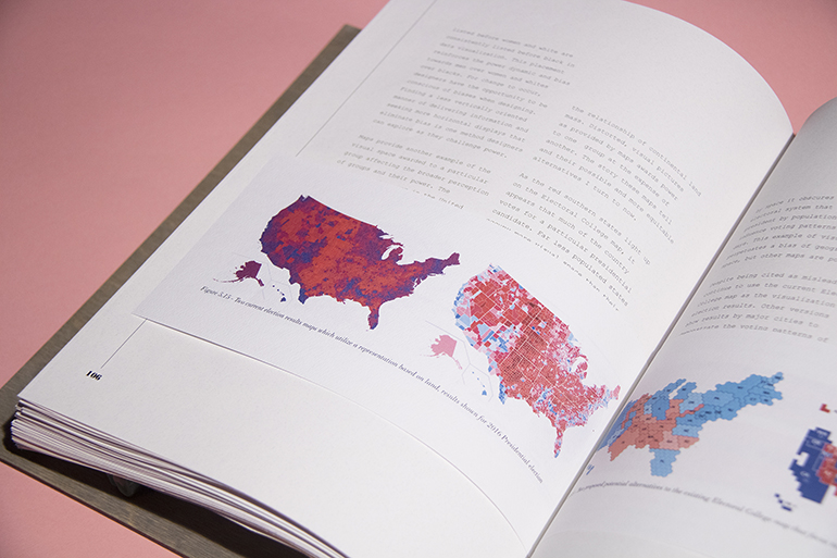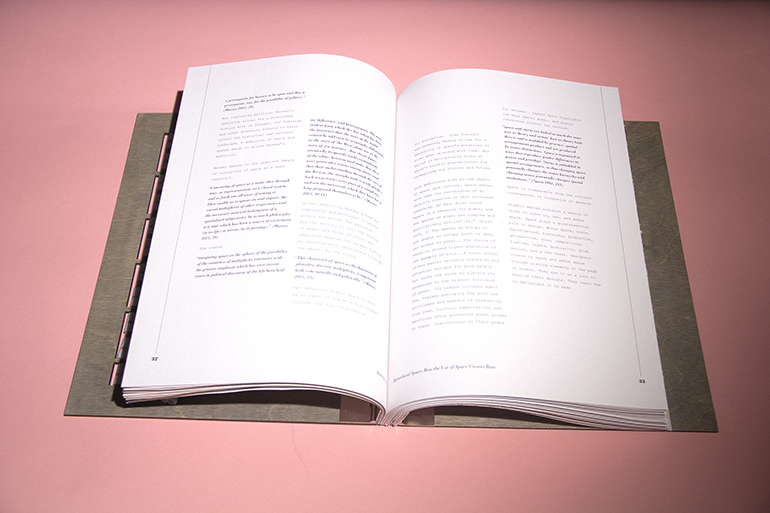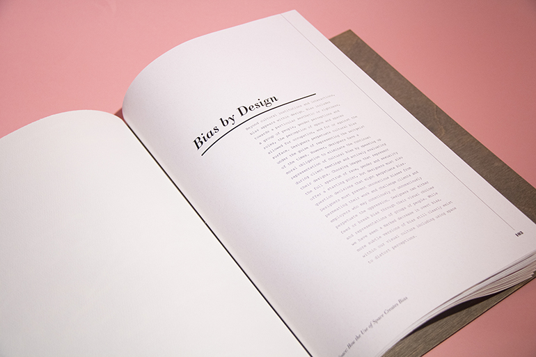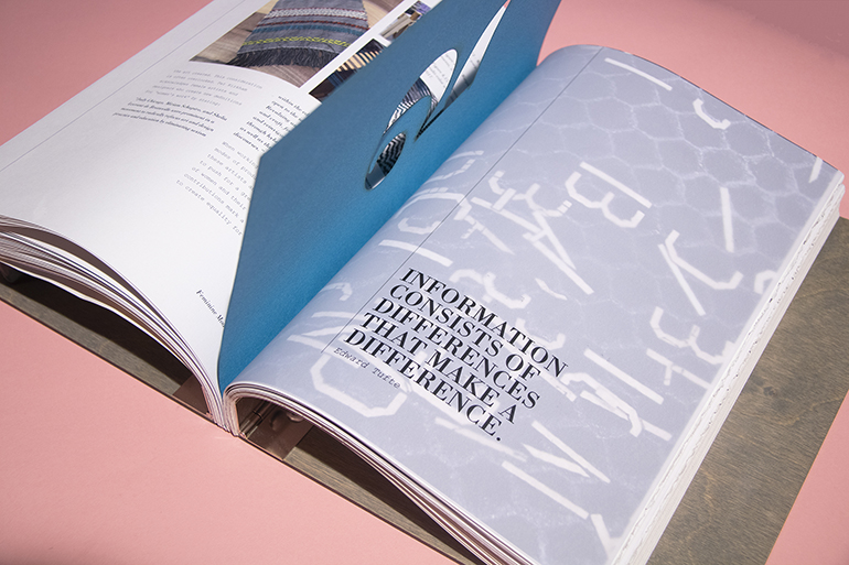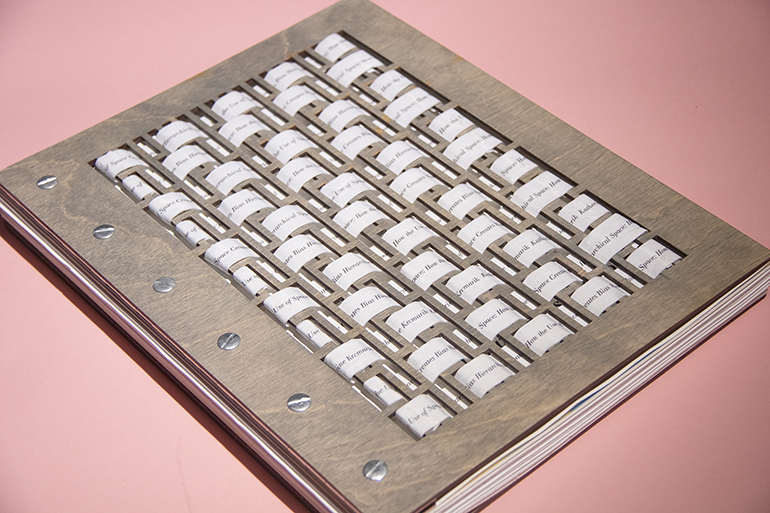 My graduate thesis book was a hand-made custom book. Each copy has aspects that are unique to the individual book. The books feature custom die-cut pages, a range of paper types, custom inserts, french folds, and is bound using post and screws along with silver piano hinges. The cover was cut using a laser cutter and then hand-woven. The goal with the book was to produce a sensory experience respresentative of my studies during the program. Twelve copies were created of the book.