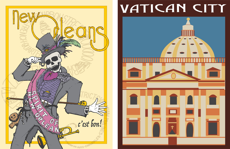 For this project, you will create a poster to advertise a particular destination. From a style stand point, I would like you to focus on more vintage styles. The poster should highlight a particular aspect of the destination that may appeal to a potential tourist. It may be a landmark or it may be something the destination is known for. For example, Florida is known for oranges so you may feature oranges prominently. You may also choose to incorporate a number of elements into the final design. The illustration portion will feature an interpretation of the landmark or other destination element(s). You will need to include text at minimum of the name of the destination. You may also want to include the word visit or a tag line like “What Happens in Vegas Stays in Vegas”. You will also want to consider a vintage appropriate color palette.
