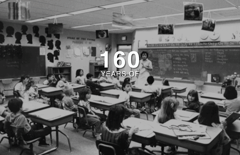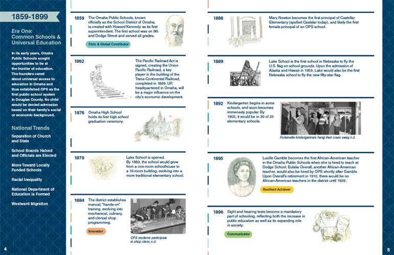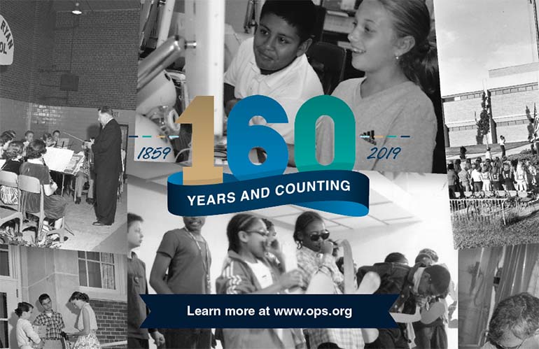 Omaha Public Schools (OPS) celebrated their 160th anniversary in 2019. To commemorate this feat and the strides made by the district over time, OPS commissioned a mural in the Teacher Administration Center located in Downtown Omaha. The mural consists of 5 panels, with each panel recounting 40 years worth of OPS history anda final panel to envision the future.