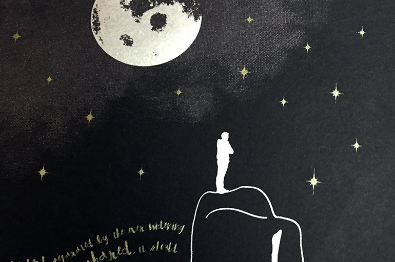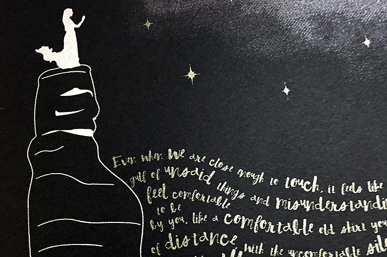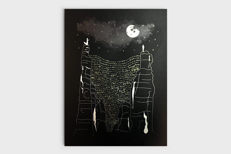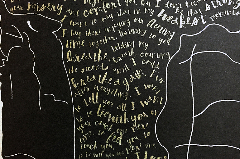 I reached a point in a relationship where we were not communicating. We were forced to interact with each other but in a very perfunctory way. It killed me having to pretend nothing was wrong but he seemed completely fine with things. The fakeness of it started to wear on me. I made this print to deal with my feelings rather than explode at him. I desparately wanted to be able to actually talk to him again rather than continue pretending. I wanted even just moment of what it was before even though it was no longer possible. The use of silver and gold inks plays to the ugly/beautiful concept I started with All the Things I Should Have Said and Tell Me A Secret. The print looks pretty on the surface even though you see all the pain when you dive into the words and images.