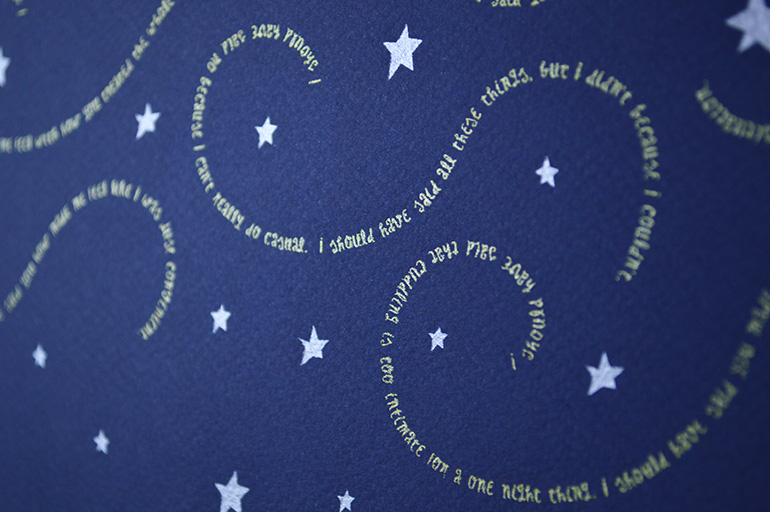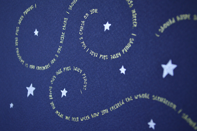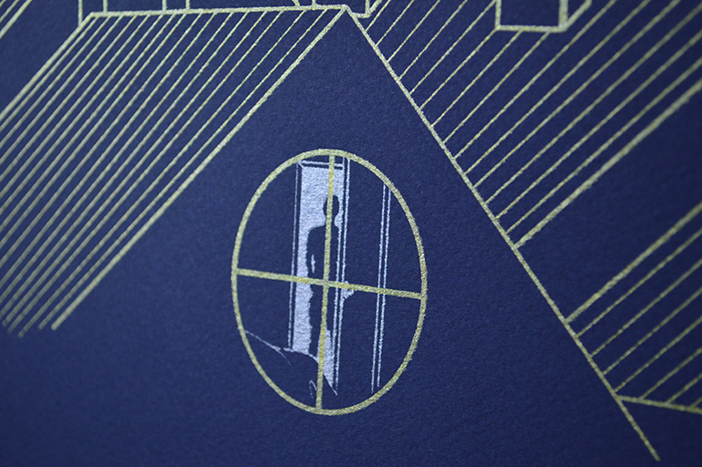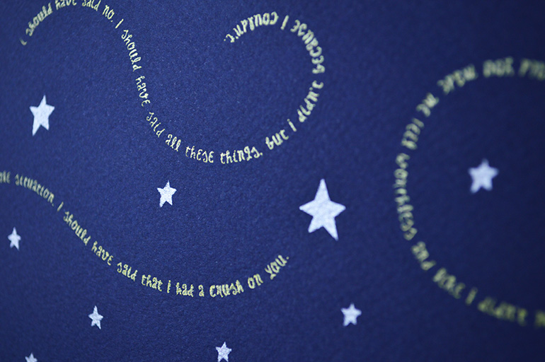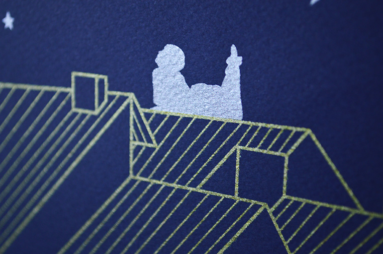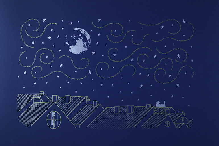 This print is about dealing with what I needed to say to someone but couldn’t. The overall is something beautiful in delicate, which is contrast to the pain and hurt expressed in the words. I put everything I wanted to say in the swirls in the sky. The person in the window speaks to what happened. The person on the roof represents me looking at what I want to say almost like I’m making a wish.