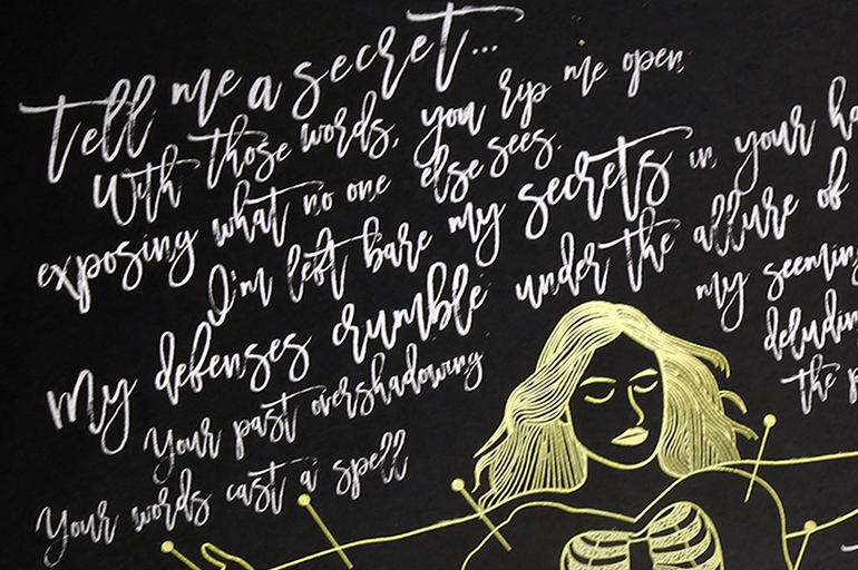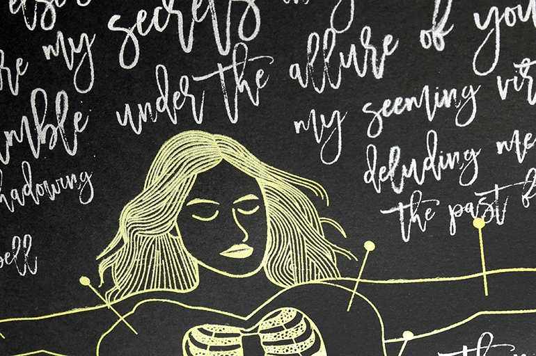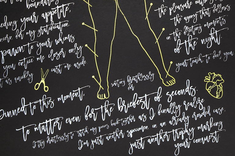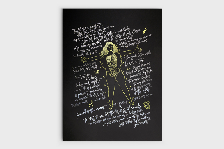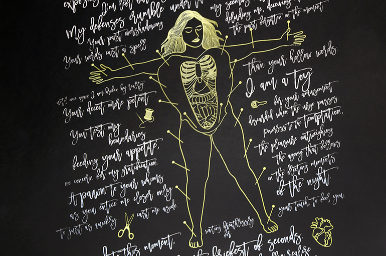 The print sums up my feelings up dealing with a very manipulative person who kept pushing and pulling me away from him. The words start with one of his favorite games to play with me. The rest of the words highlight how I felt during the exchanges including the highs and lows and the games played with me. The image of the woman cut open visually shows how I feel after these interactions. I treated her like a specimen in a display case because that’s how I felt I was treated, just an experiment for the person with no concern for my feelings. The use of silver and gold inks plays to the ugly/beautiful concept I started with All the Things I Should Have Said. The print looks pretty on the surface even though you see all the pain when you dive into the words and images.