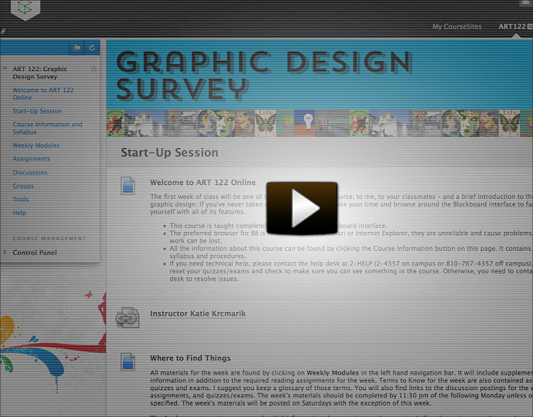 This is an example of my abilities to create a screencast. This screencast is meant to serve as an introduction to the ART 122 online course I developed. It walks students through navigating the course, some basic expectations for the course, and the requirements to get started with the course. The screencast was created in Jing. (Note: I have also created screencasts using Camtasia, Quicktime, and Adobe Captivate.)