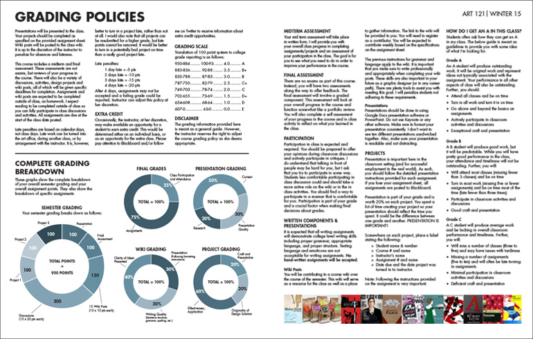 This project originally came about after I radically redesign my syllabus in order to better address the needs of my students. My goal was to reduce the number of questions I was asked about things already in the syllabus by making it more accessible to students. My efforts were a success and I have run several professional development sessions on how faculty can improve their syllabus's effectiveness on campus. I have also presented it at the 2014 LAND Conference (Liberal Arts Network for Development) and won first place in the Adjunct Faculty category. I have continued to perfect my syllabus and incorporated QR codes into this semester to allow students to easily add assignment deadlines to their calendars and my contact information to their contacts.